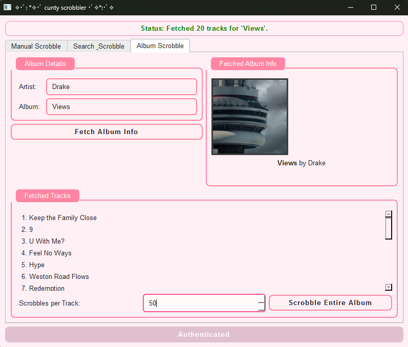 a python-based last.fm scrobbler with a yassified ui, built for a client wanting a girly and functional solution.